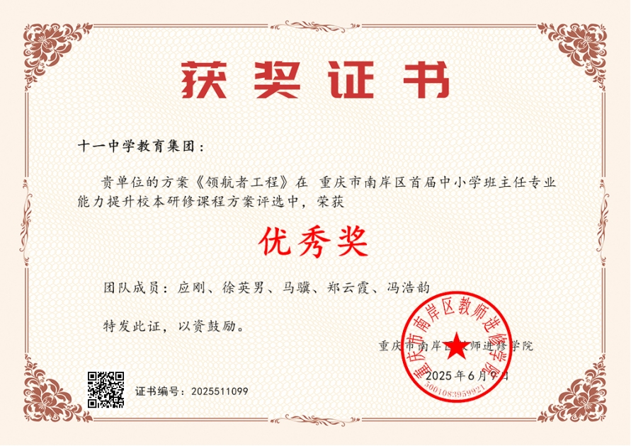 在新时代教育改革浪潮奔涌向前之际,国家将基础教育人才队伍建设置于前所未有的战略高度。十一中教育集团以党的二十大精神为灯塔,深入践行《教育部关于进一步加强中小学班主任工作的意见》,将班主任专业发展作为核心引擎,精心打造《领航者工程》十一中教育集团班主任专业能力提升校本研修课程方案。该方案在南岸区组织开展的首届中小学班主任专业能力提升校本研修课程方案评选活动中荣获“优秀奖”。