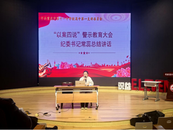 为进一步深化全面从严治党,强化党员教师的纪律意识和责任担当,2025年10月21日上午8时,中共重庆市第十一中学校第一支部委员会在识益演播厅组织召开“以案四说”警示教育大会。会议由党支部书记徐英男同志主持,高中第一党支部全体党员参会,学校纪委书记常蕊同志莅临现场指导。